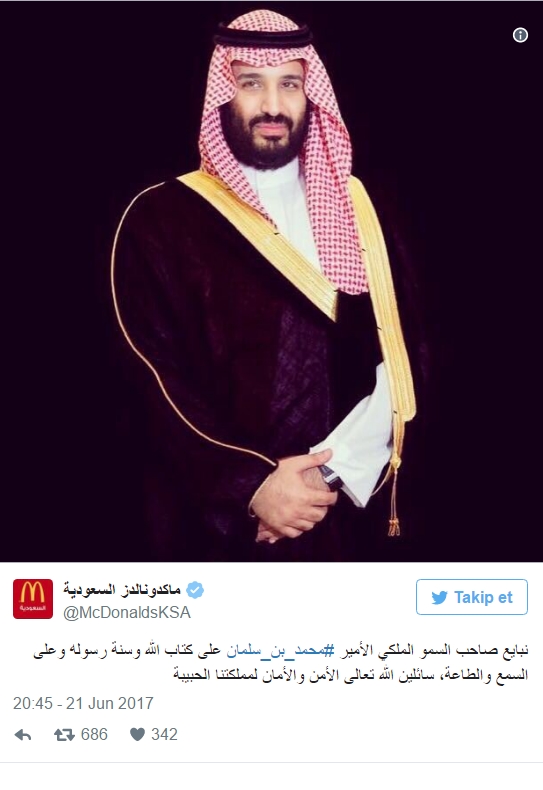 McDonalds, Suudi Arabistan hesabından attığı tweette “Suudi Arabistan meliki Muhammed bin Selman’a Kuran ve Sünnet çerçevesinde işitip uymak hususunda biat ediyoruz. Memleketimiz için Allah’tan emniyet ve güvenlik niyaz ederiz” ifadesine yer verdi.