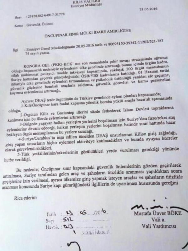 Emniyet Genel Müdürlüğü, Kilis ve Gaziantep valiliklerine 20 Mayıs 2016 tarihli “gizli” ibareli bir yazı gönderdi ve çarpıcı uyarılarda bulundu. Kilis Vali Yardımcısı Mustafa Ünver Böke de bu uyarı kapsamında Öncüpınar Sınır Mülki İdare Amirliği’ne 21 Mayıs 2016 tarihli “güvenlik önlemi” konulu bir yazı gönderdi.